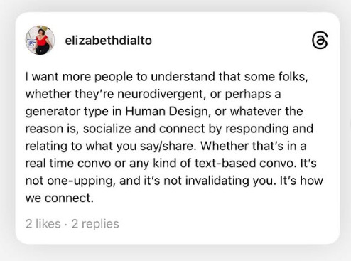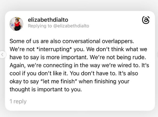 I love this post because this is how I interact with people and what she says about the style and intention is spot on for me. I interrupt myself constantly. I am also a Generator in Human Design and I probably am neurodivergent in some way or other. I have one friend that while she has never said anything about it, I am certain she can never follow what I am saying because I interrupt myself and go on tangents so often.